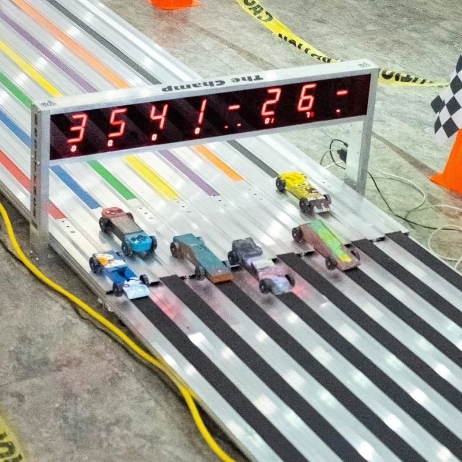 Each vehicle will race on each lane of the track once, equaling 8 total heats per vehicle, per race. The results will be calculated. The fastest time out of the 8 heats is taken for each derby car in that race time.